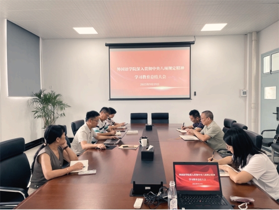 9月19日上午,外国语学院党委在信礼楼304会议室召开深入贯彻中央八项规定精神学习教育总结大会,全面回顾和总结学习教育开展情况,对巩固拓展学习教育成果、推动作风建设常态化长效化进行部署。学院全体党委委员参加会议,党委书记何宏主持会议。