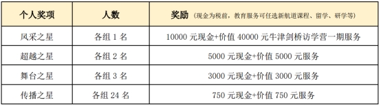 全国阶段/中外青少年展演奖项:所有参与的选手将被授予“中国故事精彩讲述者”称号,并用个人奖项做差异区分排名第1、排名第2~3、排名第4~6以及排名第7~30名的选手。
