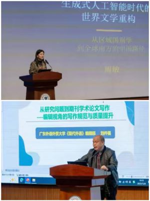 本次论坛共设置5场主旨报告与5场平行分论坛。主旨报告环节特邀两位专家与三位获奖研究生进行分享。周敏教授以《生成式人工智能时代的世界文学重构:从区域国别学到全球南方的中国路径》为题,深入探讨了人工智能如何影响文学研究范式,并指出应主动运用AI赋能世界文学研究,推动中国学术路径的国际化表达。广东外语外贸大学刘件福研究员则从编辑视角出发,聚焦“以研究问题为主线”的学术论文写作,系统分析了选题、摘要、正文等环节的常见问题,并提出了具有操作性的改进建议,为青年学子的论文撰写提供了清晰指引。